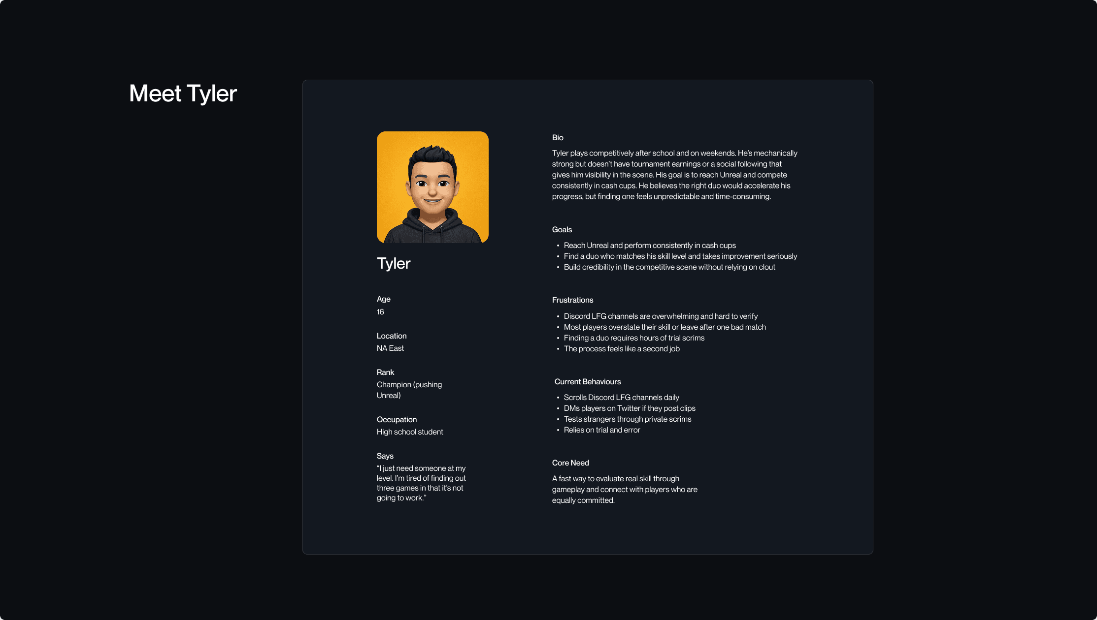 The discovery view was intentionally simple. Region and key performance metrics were visible, but secondary to gameplay clips. The goal was to allow users to evaluate someone confidently within seconds, keeping the interface focused while still providing essential context.