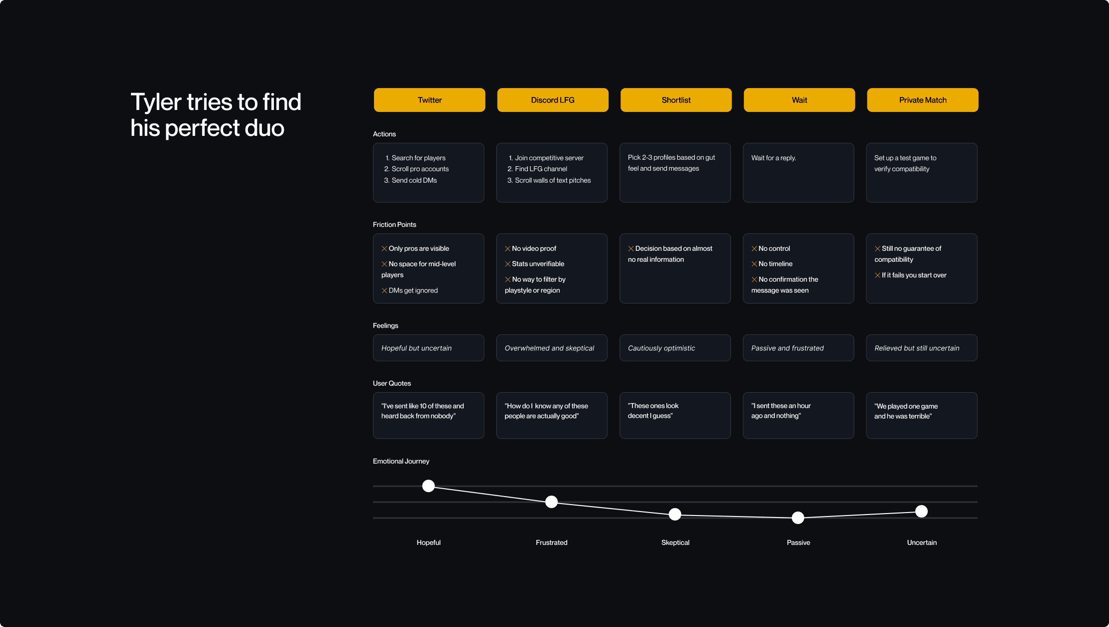 Early feedback confirmed that the frustration was real. Players agreed that finding a good duo was inefficient, and they understood the value of the concept. However, most were not motivated to change their current behavior.